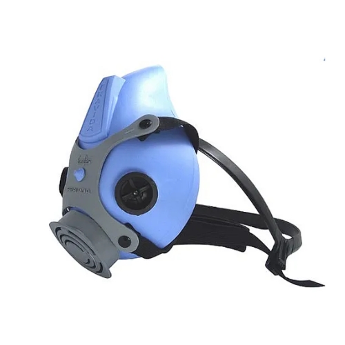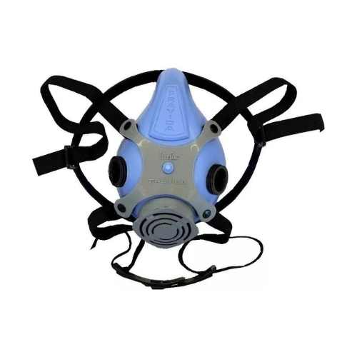 Con una válvula exhaladora y dos válvulas inhaladoras que permiten el acople de dos filtros.